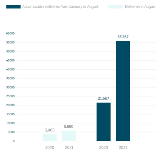 NIO has delivered a total of 131,408 cars as of 31st August 2021.