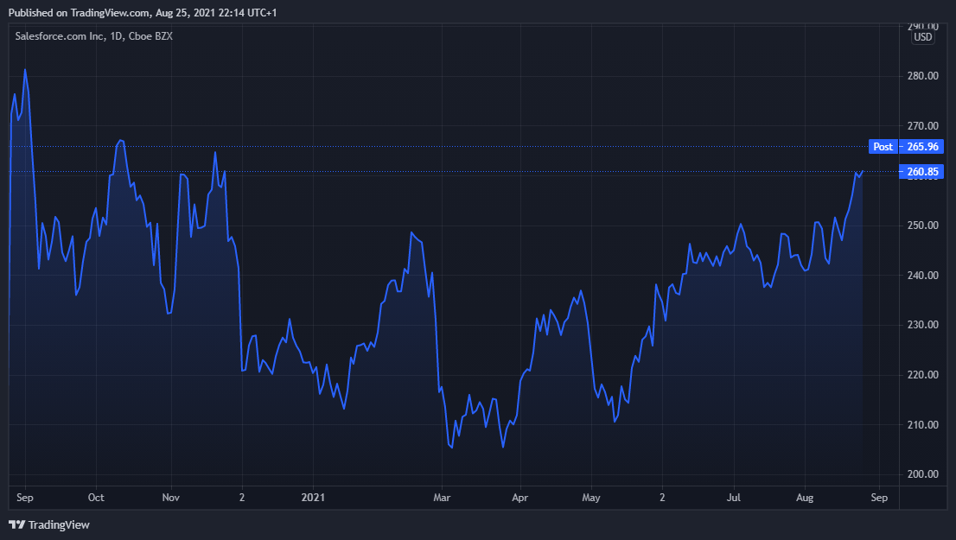 Shares of Salesforce were trading higher in the after-hours trading following the latest earnings numbers – up by 1.86%. The stock is up by 20.74% in the last year after ending the trading day on Wednesday at $260.85 per share.