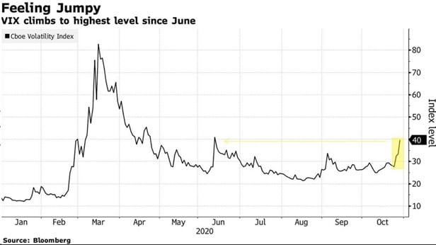 Just days ahead of the crucial presidential election and surging coronavirus cases in the US and Europe, volatility soared to the highest level mid-June. The CBOE Volatility Index which is a real-time market index providing a measure of market risk and investors’ sentiment rose above 40 earlier this week.