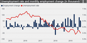 Employment rose by 54,000 in September driven by gains in full-time work while the unemployment rate declined by 0.2% to 5.5%. The growth was mostly seen in the self-employment and public sector employees.