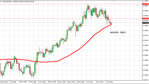 This caused a sharp drop in the AUDUSD exchange rate pushing it briefly below the all important 50 day moving average. This average is now an important support level in the coming days for AUDUSD.