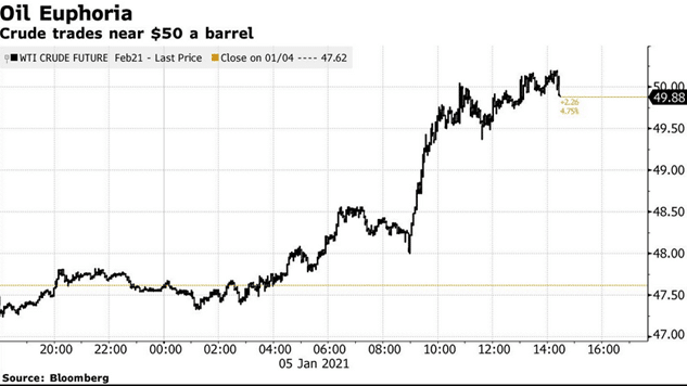 While the Tuesday’s 13th OPEC and non-OPEC Ministerial Meeting acknowledged the need to gradually return 2 mb/d to the market, with the pace being determined according to market conditions, it reconfirmed the decision made at the 12th ONOMM to increase production by 0.5 mb/d starting in January 2021, and adjusting the production reduction from 7.7 mb/d to 7.2 mb/d. However, the crude oil prices buoyed on the surprise announcement from Saudi Arabia – they would voluntarily cut an additional 1 million barrels per day in February and March above its current quota while all while OPEC’s allies get to ramp up production. As of writing, WTI Crude oil (Nymex) and Brent Crude (ICE) were trading at around $49.75 and $53.60 respectively.