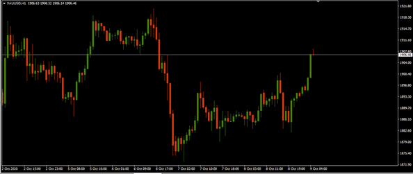 The precious metal caught a breather on a weaker US dollar and hopes of a new US stimulus package. After dropping to a low of $1,872, the XAUUSD was seen trading firmer above the $1,900 level towards the end of the week.