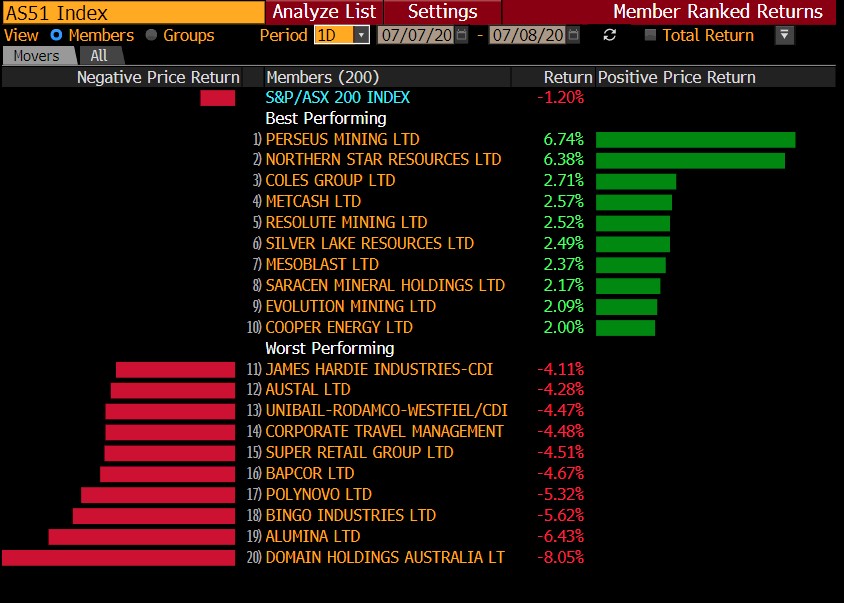 Faced by the resurgence of infections in other countries as well, global stocks seemed to have paused on Tuesday. Following Wall Street’s leads and the lockdown announcement of Victoria, the ASX is trading in a sea of red on Wednesday. To the exception of the Consumer Staples sector which constitutes of stocks of companies and businesses that manufacturers or distributes essential products, most sectors are trading in negative territory: