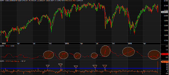 Another interesting observation comes from the orange line. This line measures the daily changes in the red line (the standard deviation line ). As can be seen, each time there was a surge in the orange line (highlighted by small triangles in the lower section of the chart), markets have faced a period of high volatility (represented by an upward slope in the red line).