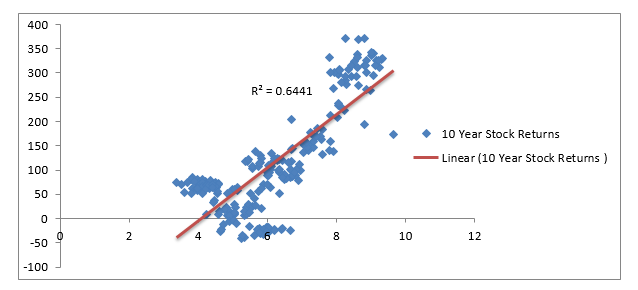 As you can clearly see, there is a positive relationship between rates and stock returns. As rates move to the right of the graph (go higher), the ten-year stock returns move higher. The R² of 65%, indicates that statistically, 65% of S&P500’s returns can be explained by the ten years US rates.