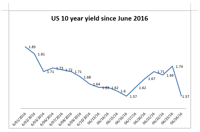 In response to Brexit, which caused an increased level of uncertainty, investors rushed to safe haven assets such as government bonds which in turn caused a severe drop in yields. Remember that bond prices and yields have an inverse relationship so that each time traders rush into bonds, yields drop.